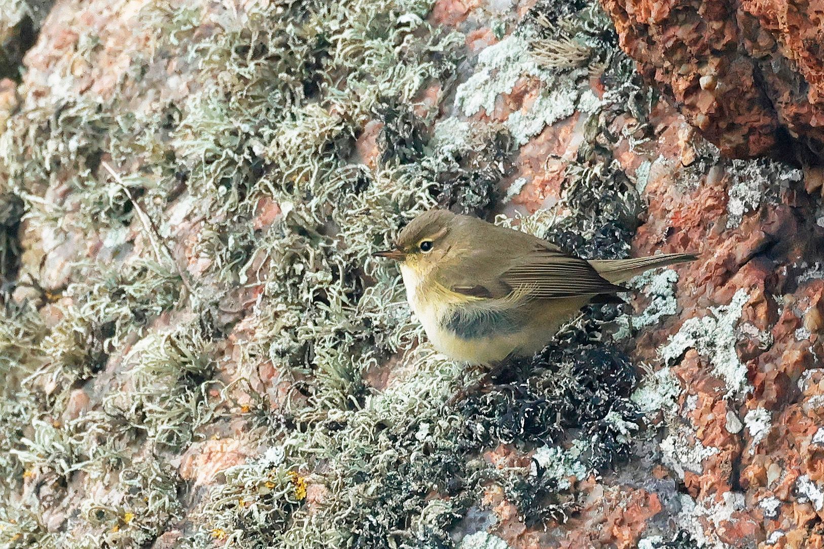Below: This morning's Chiffchaff at Corbiere, resting after it's very late arrival for a nocturnal migrant.