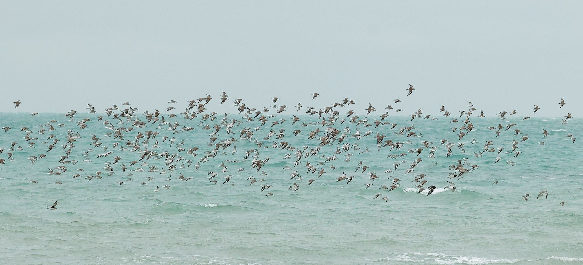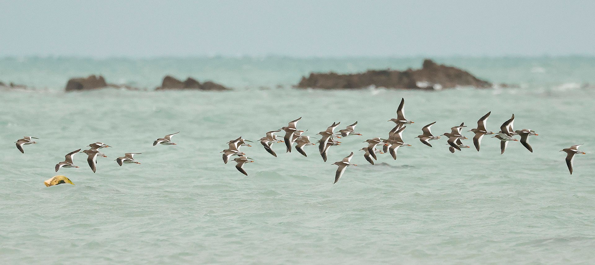 Below: Redshanks and a large flock of mixed waders in Grouville Bay this morning MD